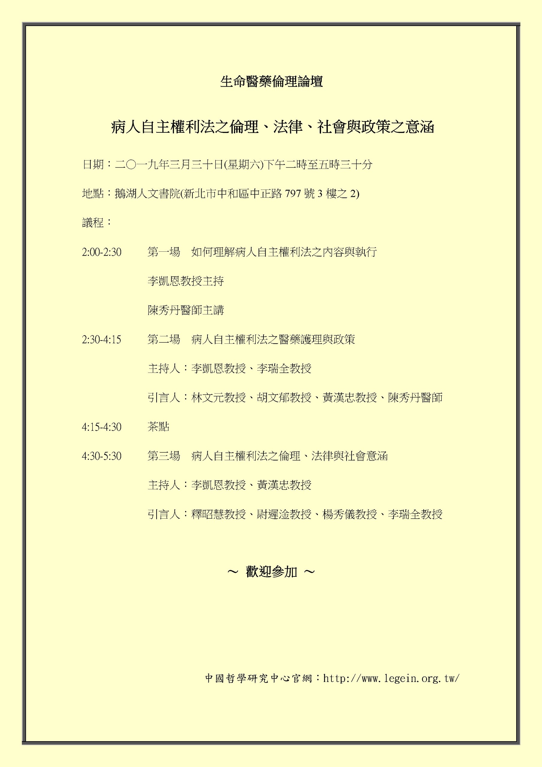 「病人自主權利法」已經在2019年1月6日正式執行,此法關係我們每一個人的臨終決定,而法條中許多重要的生命倫理的概念和權益,以及執行的政策等,尚有待我們作出嚴謹的學理分析、反省和完善相關的政策與運作程序,使我們每個人都能藉此取得最佳的臨終的生死決定,達到養生送死無憾。因此,中國哲學研究中心、國立中央大學哲學研究所、中國醫藥大學醫學系社會醫學科、中國醫藥大學附設醫院社區暨家庭醫學部與台灣生命理學會聯合舉辦一場學術論壇,邀請各方面的學者專家為我們分析和詮釋此法各方面的意涵。 我們現訂於2019年3月30日(星期六)下午二時至五時三十分,於鵝湖人文書院(新北市中和區中正路797號3樓之2)聯合舉辦一學術論壇:病人自主權利法之倫理、法律、社會與政策之意涵。 欲參加者,請點進以下網址報名:https://docs.google.com/forms/d/e/1FAIpQLScHrK9rWfucKlV9272-TmQCC5bBtbOzSjp2h2BFdXXPpxxJ2A/viewform