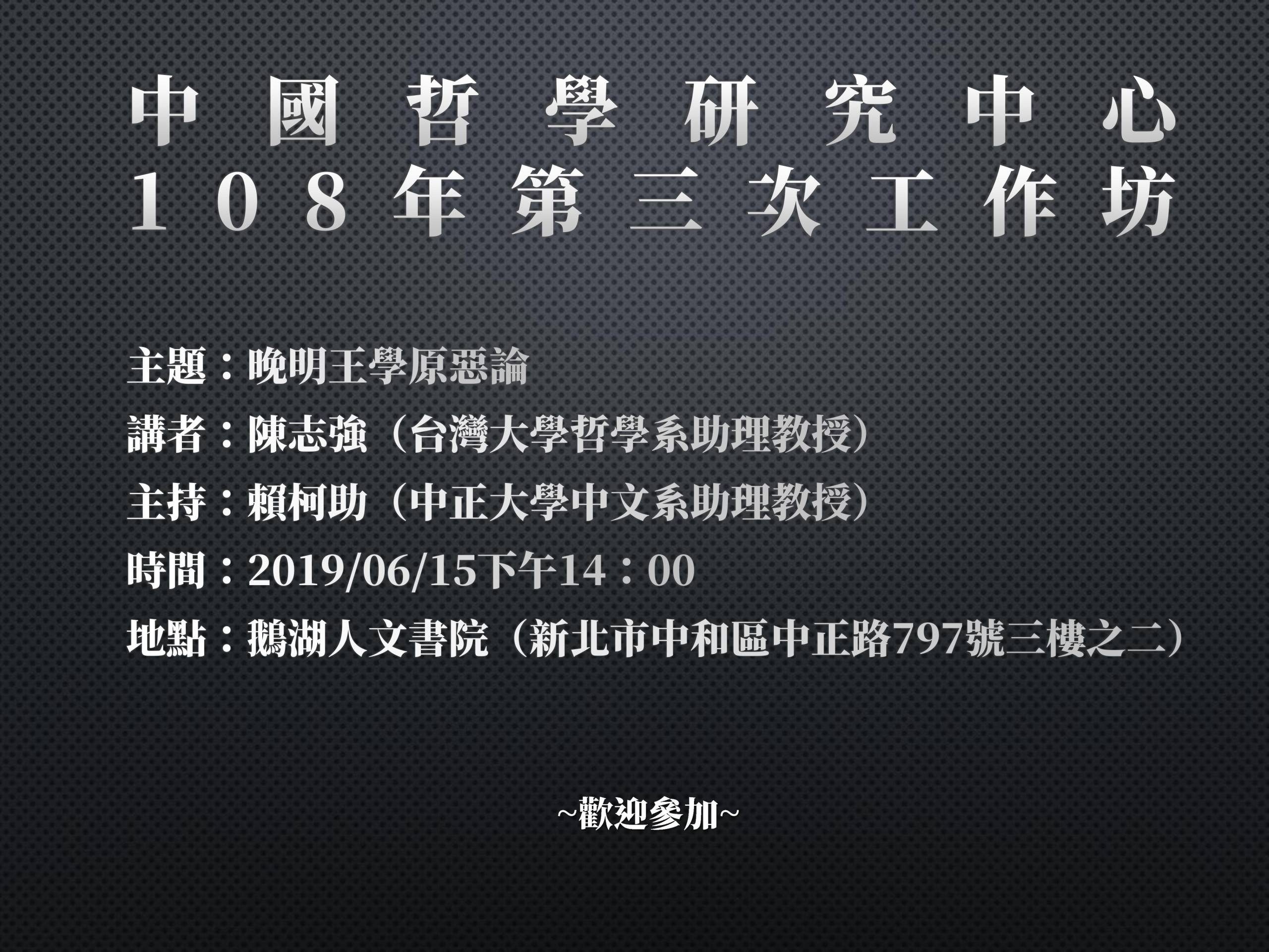 中國哲學研究中心 108年第三次工作坊 主題:晚明王學原惡論 講者:陳志強(台灣大學哲學系助理教授) 主持:賴柯助(中正大學中文系助理教授) 時間:2019/06/15下午14:00 地點:鵝湖人文書院(新北市中和區中正路797號三樓之二) 講者簡介: 香港中文大學哲學博士,現任國立臺灣大學哲學系助理教授(2017-)。過往曾任教於香港中文大學哲學系(2015-17)及香港科技大學人文學部(2016-17)。2014-15年獲頒富布萊特(Fulbright)-研資局香港研究學者獎,赴美國波士頓大學擔任訪問學人。主要研究領域爲宋明理學、中國哲學史、比較哲學等。 工作坊主題說明: 人性非惡?惡從何來?如何去惡? 雖然理論上去「惡」與為「善」是修身的一體兩面,但歷史上「惡」的議題卻少見顯題與系統的論述。我們將從哲學史角度清理晚明王學──自王陽明以降,下轄陽明後學,直到劉蕺山為止──的理論資源,繼而系統地開拓出一套關於「惡」的哲學理論。 講者專書《晚明王學原惡論》介紹:點我